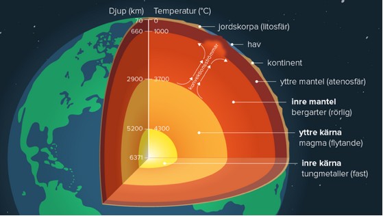 Jorden var först ett glödande klot. För ungefär 4,4 miljarder år sedan, kraschade ett föremål av mars storlek in i jorden och sprängde loss tillräckligt material för att åstadkomma ett beledsagande klot, månen. I jordklotet samlades de tyngsta ämnena (järn, nickel, uran m.fl.) i jordklotets mitt av tyngdkraften, gravitationen. Vissa av dessa, uran m.fl. är radioaktiva och i jordens kärna pågår sedan dess ett radioaktivt sönderfall som värmer upp jordklotet. Temperaturen i den fasta kärnan är drygt 5000 grader. Utanför denna är kärnan i ett flytande tillstånd. Mellan kärnan och jordskorpan finns den halvflytande, plastiska manteln. Jordskorpan hängde i början ihop och bildade kontinenten Pangea. Den har sedan spruckit isär för att idag bestå av ett antal kontinentalplattor som rör sig i förhållande till varandra och ger upphov till jordbävningar och tsunamier.