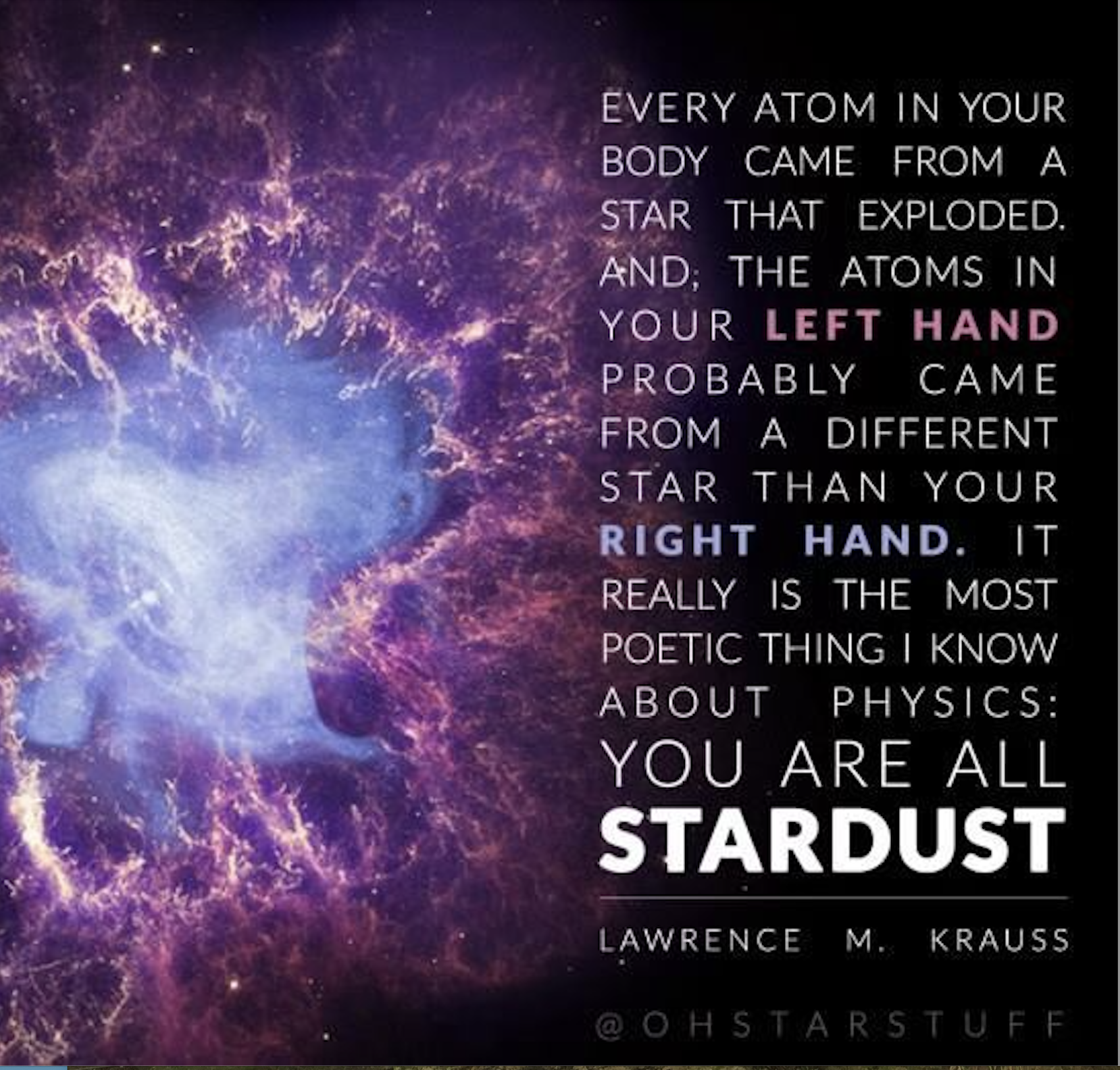 Alla grundämnen tyngre än väte och helium bildades i döende exploderande stjärnor. Atomerna i våra kroppar och i naturen kommer från stjärnstoft.